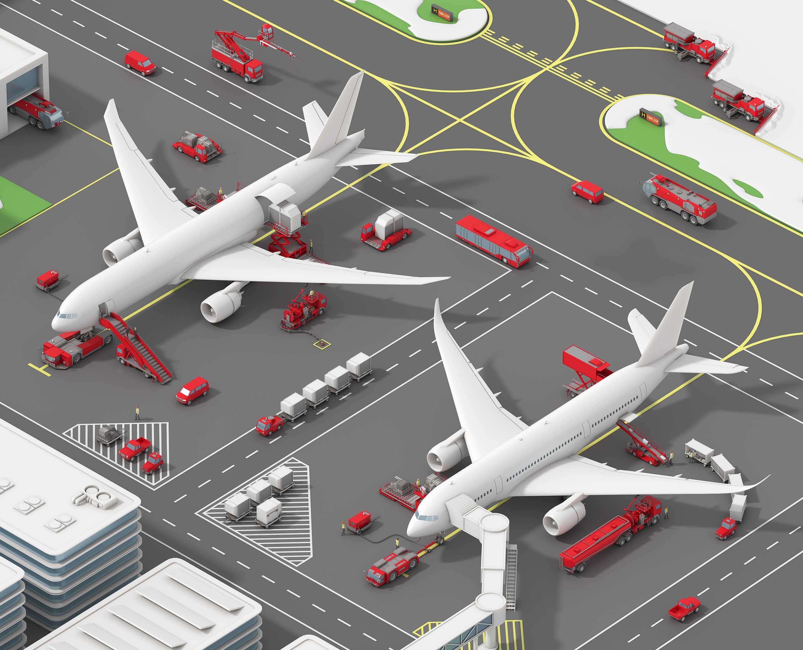 Tractores de remolque o pushbacks, cargadoras, camiones de reabastecimiento, autobuses, generadores, quitanieves... .